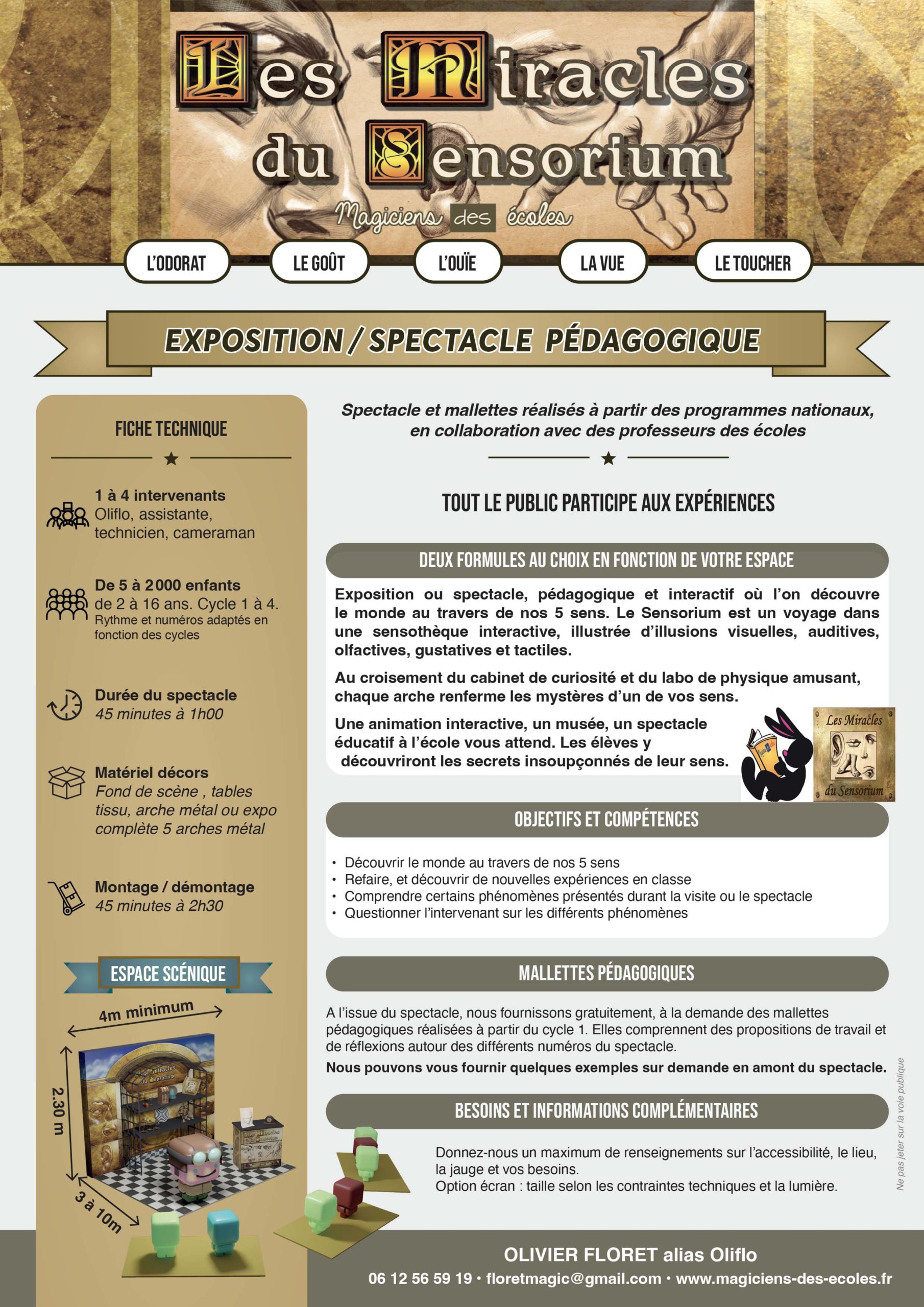 Les spectacles sont créés généralement et mis en scène par Olivier Floret, alias Oliflo, magicien et comédien passionné par l’éducation.